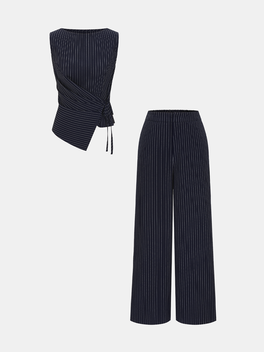 Pinstripe Wrap Top & Wide-Leg Pants Set
